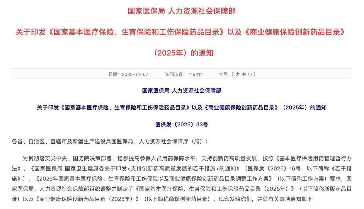 2025年12月7日,国家医保局、人力资源社会保障部印发2025年版国家基本医疗保险、生育保险和工伤保险药品目录和商业健康保险创新药品目录。