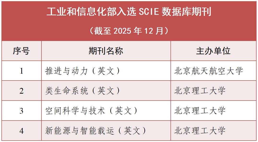 人民网北京12月19日电 (记者申佳平)据“工信微报”消息,近日,由北京理工大学主办的期刊《空间科学与技术(英文)》(Space:Science& Technology)和《新能源与智能载运(英文)》(Green Energy and Intelligent Transportation),正式被科睿唯安(Clarivate)旗下的科学引文索引SCI的扩展版SCIE数据库收录。至此,工业和信息化部已有4种英文期刊被SCIE收录。
